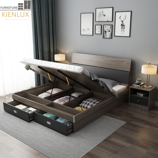 + Giường cao cấp được thiết kế 3 hộc kéo chứa quần áo, đồ dùng cá nhân được tích hợp bên dưới giường nên rất gọn gang và tiện dụng và đặt biệt Giường còn tích hợp thêm 3 ngăn chứa đồ dưới giường, có thể mở lên, xuống dễ dàng, thuận tiện khi sử dụng và tiết kiệm diện tích cho gia đình.
