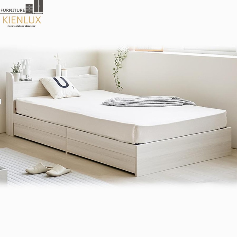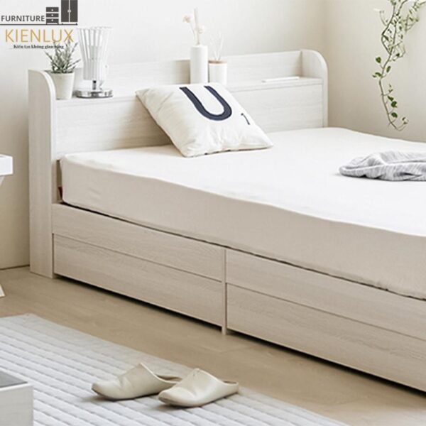 + Giường cao cấp được thiết kế 3 hộc kéo chứa quần áo, đồ dùng cá nhân được tích hợp bên dưới giường nên rất gọn gang và tiện dụng và đặt biệt Giường còn tích hợp thêm 3 ngăn chứa đồ dưới giường, có thể mở lên, xuống dễ dàng, thuận tiện khi sử dụng và tiết kiệm diện tích cho gia đình.