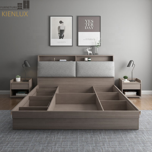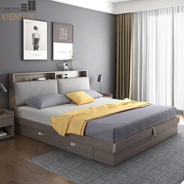 + Giường cao cấp được thiết kế 3 hộc kéo chứa quần áo, đồ dùng cá nhân được tích hợp bên dưới giường nên rất gọn gang và tiện dụng và đặt biệt Giường còn tích hợp thêm 3 ngăn chứa đồ dưới giường, có thể mở lên, xuống dễ dàng, thuận tiện khi sử dụng và tiết kiệm diện tích cho gia đình.